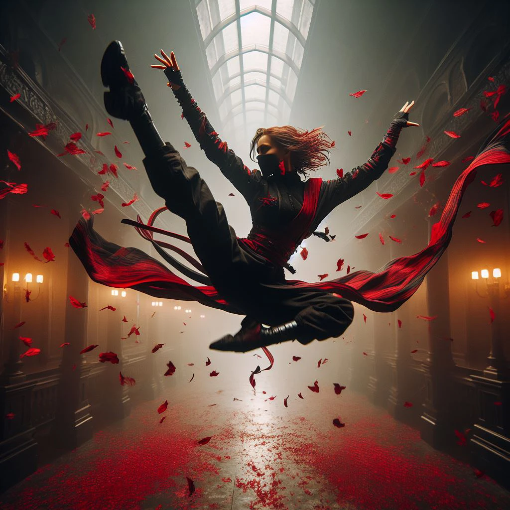 Photograph of a woman with long, auburn hair leaping through the air. She is dressed in a black ninja outfit with red accents, including a flowing red scarf. The background is an eerie, dimly-lit hallway with large, arched windows at the top, casting a soft light. Red petals are scattered around her, adding a dramatic touch. The overall mood is intense and dynamic, capturing a moment of action and movement.