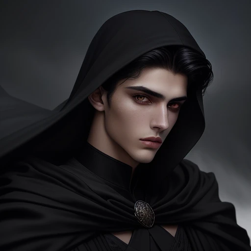 Close-up fantasy-inspired portrait of haute couture hauntingly handsome 19 year old persian male fashion model looking directly into camera, warm brown eyes, roguish black hair, wearing black assassin robes and billowing black cape, background is desert at night, ethereal dreamy foggy, photoshoot by alessio albi, editorial fashion magazine photoshoot, fashion poses, . kinfolk magazine. film grain.