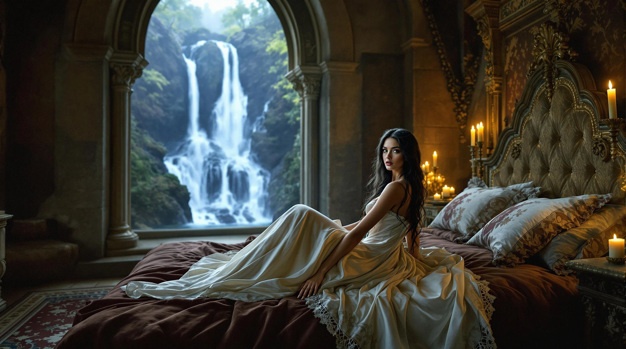 In a grand, gothic medieval master bedroom, a woman sits on a plush, velvet-covered bed, surrounded by the soft glow of candlelight. The room is adorned with intricate stone carvings and ornate tapestries, while a large, arched window behind her frames a breathtaking view of a cascading waterfall. The woman's long, dark hair cascades down her back like a waterfall of night, and her piercing green eyes seem to gleam with an inner light. She wears a flowing, white gown that drapes elegantly across her body, its delicate lace trim and subtle embroidery a testament to the skill of the seamstress who created it. The camera, a vintage Hasselblad, captures the scene with a soft, dreamy quality, as if the very fabric of reality has been woven into the image. The lighting, a combination of natural and artificial sources, casts a warm, golden glow over the entire scene, imbuing it with a sense of timelessness and wonder.