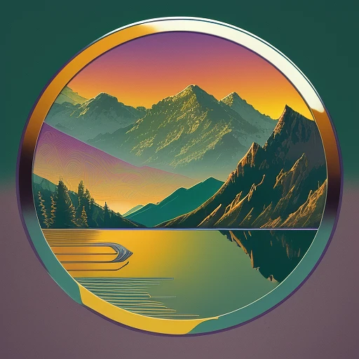 80s chrome and steel Retro Sunset, Mountain Lake scene, green, gold, illustration, inspired by James Jean 80s chtome and steel Retro Sunset, Mountain Lake scene, green, gold, illustration, inspired by James Jean, asian arrangement variation