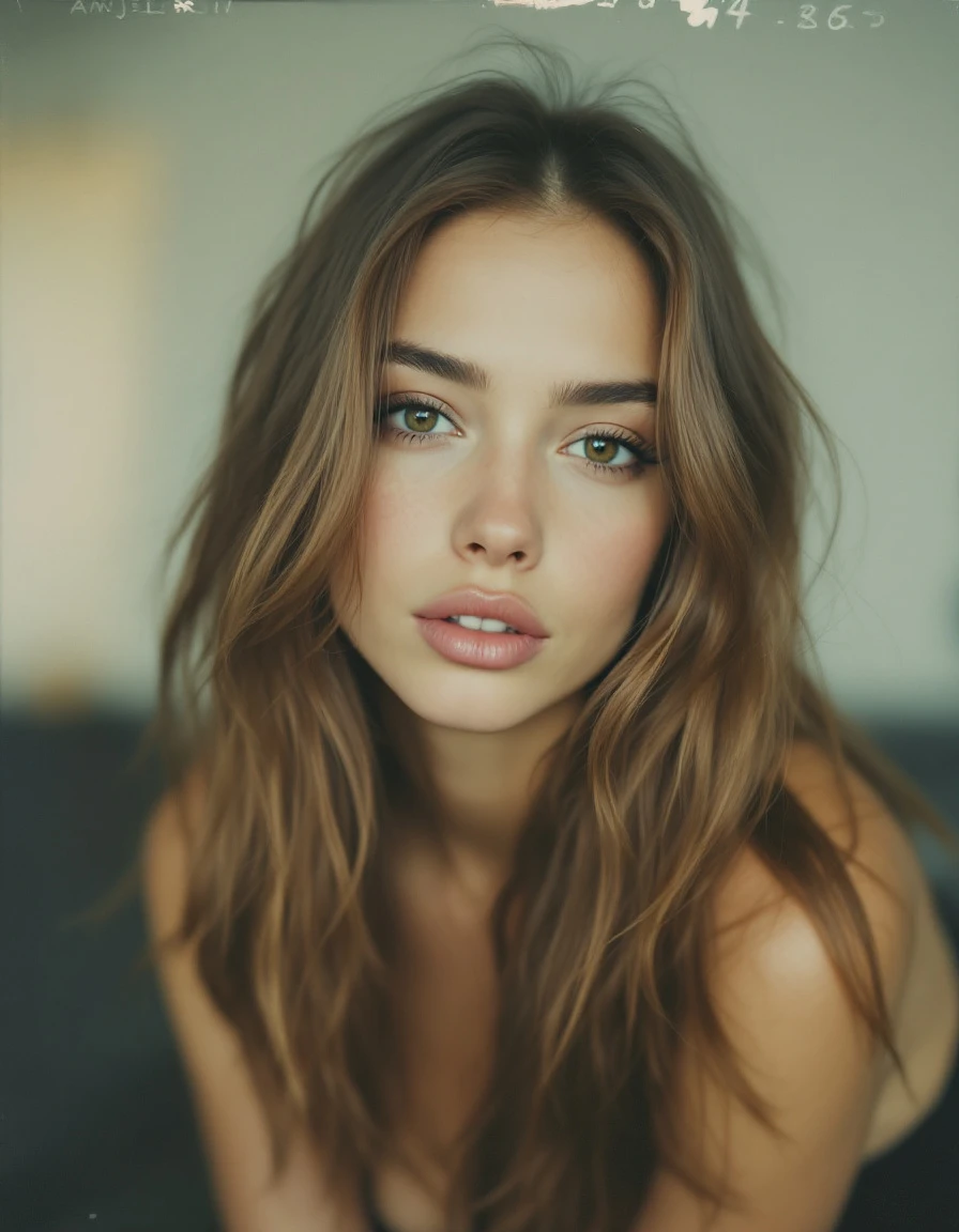 Anjelina Jollie Pitt, 21-28 years old, brown hair, high-quality photo portrait, shot on a Polaroid camera, double eyelid --ar 34:65 --style raw, imitating like a dog.