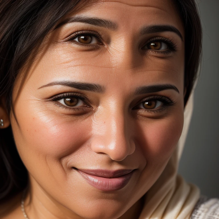 hyper realistic headshot photo of a 40 year old, arabic woman, looking into the camera, smiling slightly, ultrarealistic, soft lighting, 8k