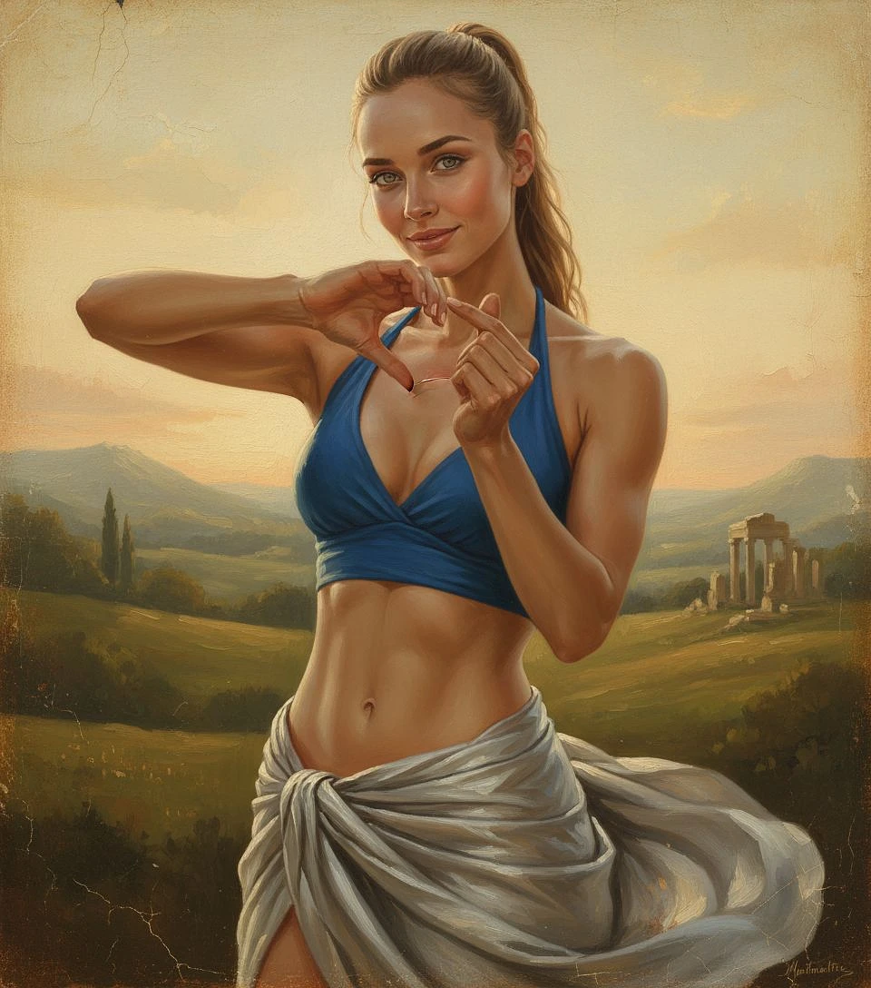 Neo-classical style painting, painted in Montmartre by an unknown artist of a semi muscular woman, green/grey yeas, dark blond ponytail stile hair wearing a cobalt blue halter top and flowing silver fabric wrap, slim waste predictable through traditional glazing techniques. Painted on aged canvas with antique varnish appearance. shows heart hand emoji