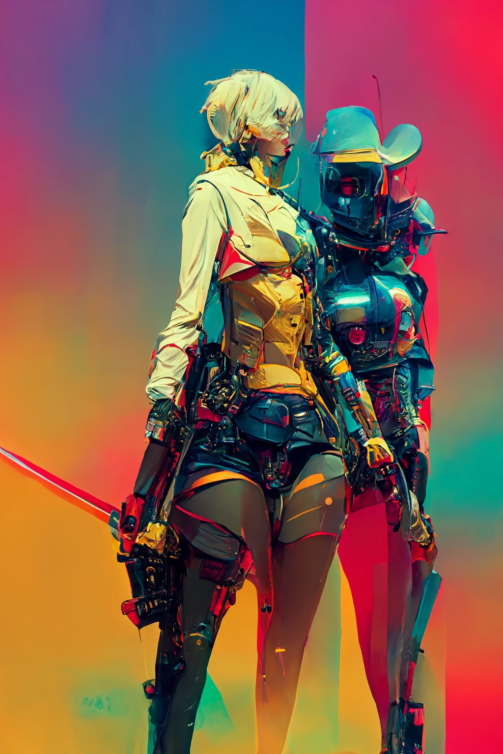 two shot disintigrating synthwave cowgirls, golden ratio, aigis from persona 3 and ciri from the witcher 3 by akihiko yoshida, bright colors, metallic, armor, stunning, breathtaking, digital render, line art, cyberpunkcity as backdrop by greg rutkowski, de - noise, 8 k, volumetric lighting, detailed contrast, trending on artstation, --ar 10:15 --q 2