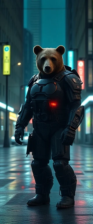 Cyborg version of a Bear in HiTech new armor. Posing In dark rainy Dystopian city in the rain, on an empty street. Neon lights in the background. Cinematic, moody , blade runner tones. Ultra 4k, hyper realistic