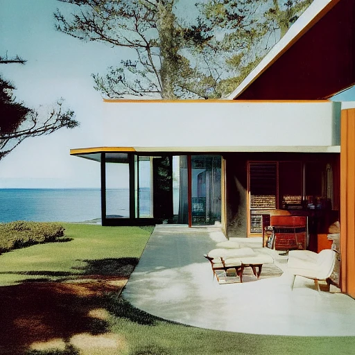 Hyper realistic eye level exterior photo of a mid century modern style house overlooking the ocean, daylight, indirect lighting, AD magazine, Frank Lloyd, Eames, Mies van der Rohe