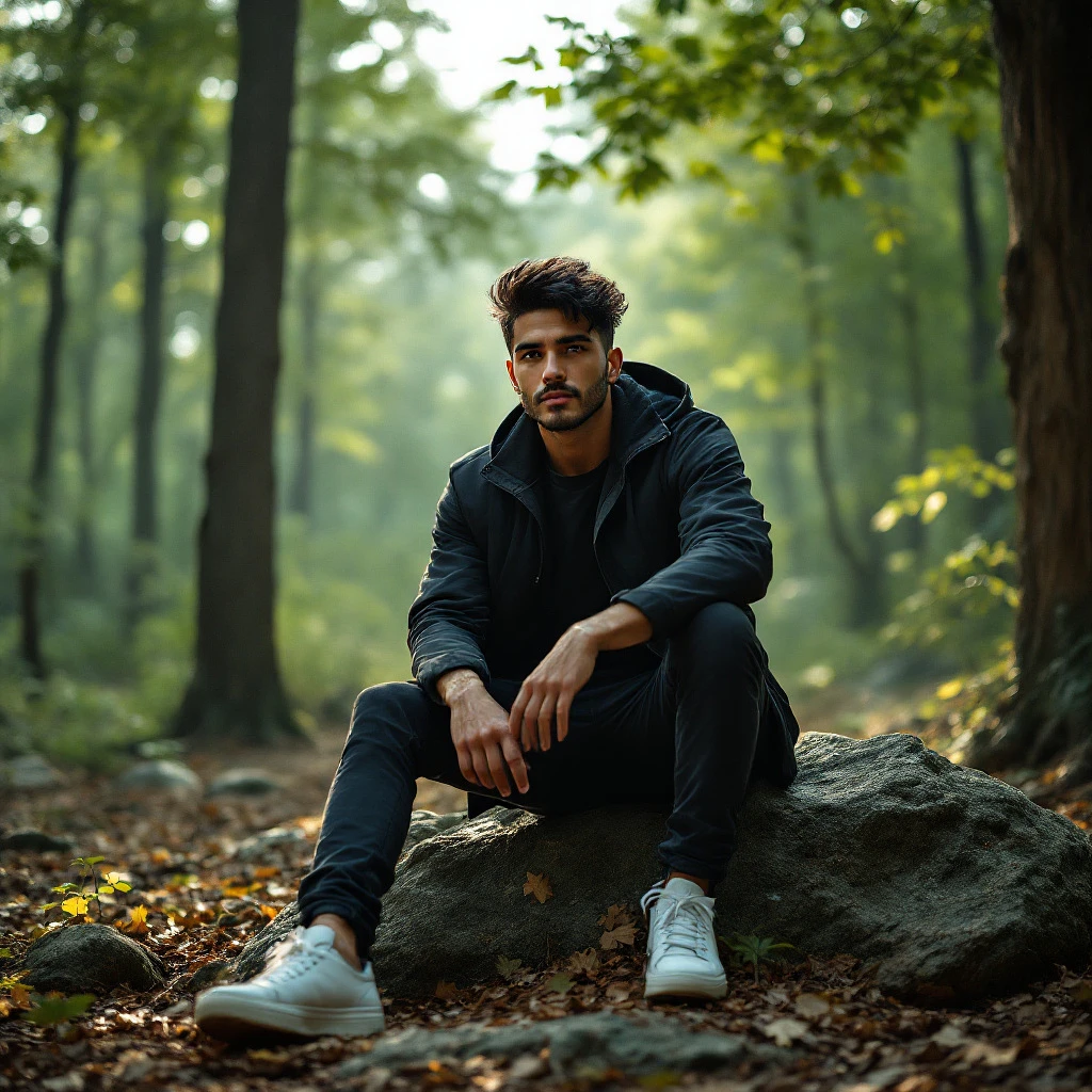 A young man about 35 years old with olive skin and black hair styled in sits gracefully on a large rock in a lush forest. he wears a black jacket complemented by white sneakers. exuding confidence. The background is a dense forest with tall trees and a carpet of fallen leaves and twigs, bathed in soft, dappled sunlight filtering through the canopy. The scene is peaceful and serene, with a shallow depth of field that blurs the background slightly, emphasizing the woman. The lighting is warm and natural, with a soft golden hour glow, creating a tranquil and inviting atmosphere. Inspired by the visual style of Terrence Malick, the image has a slight film grain and a warm, earthy color grading, enhancing the natural beauty and serenity of the forest.