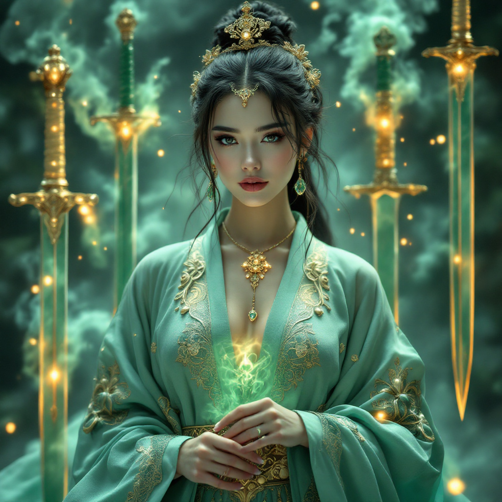 A stunning woman in a jade robe with intricate golden elements and jewelry. Behind her, swords made of gold and jade float in the air, glowing with mystical energy. Soft lighting highlights the fine details of her outfit and the metallic shine of the swords. The background features a subtle ethereal mist, adding to the fantasy atmosphere. Ultra-detailed, 8K, cinematic composition.
