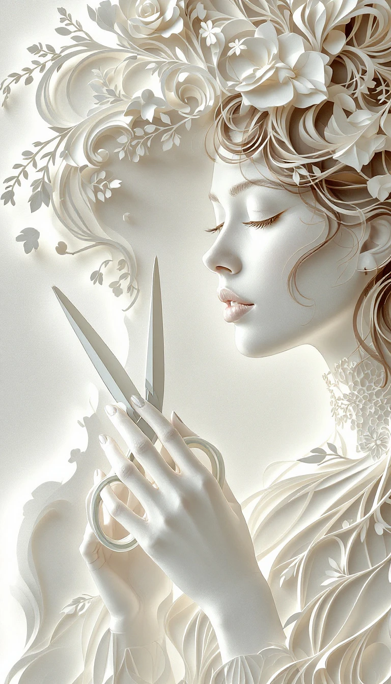 Papercutting Art, Delicate Forms, Layered Paper, Intricate, Woman Holding Scissors Cutting, Precise Movement, Quiet Music in Delicate Portrait Style, Balanced Composition, Detailed Detail and Layered Rendering, Featured in UPPERCASE Magazine, 8k Fine Art Papercutting, Folk Art Conceptual Art, Soft Light and Shadow Play, Diffused Light and Paper Shadows, Award Winning Papercutting Art, Masterpiece, Paper and Scissors, Hans Christian Andersen, Kara Walker, Lotte Reiniger, Rob Ryan, Beatrice Coron.