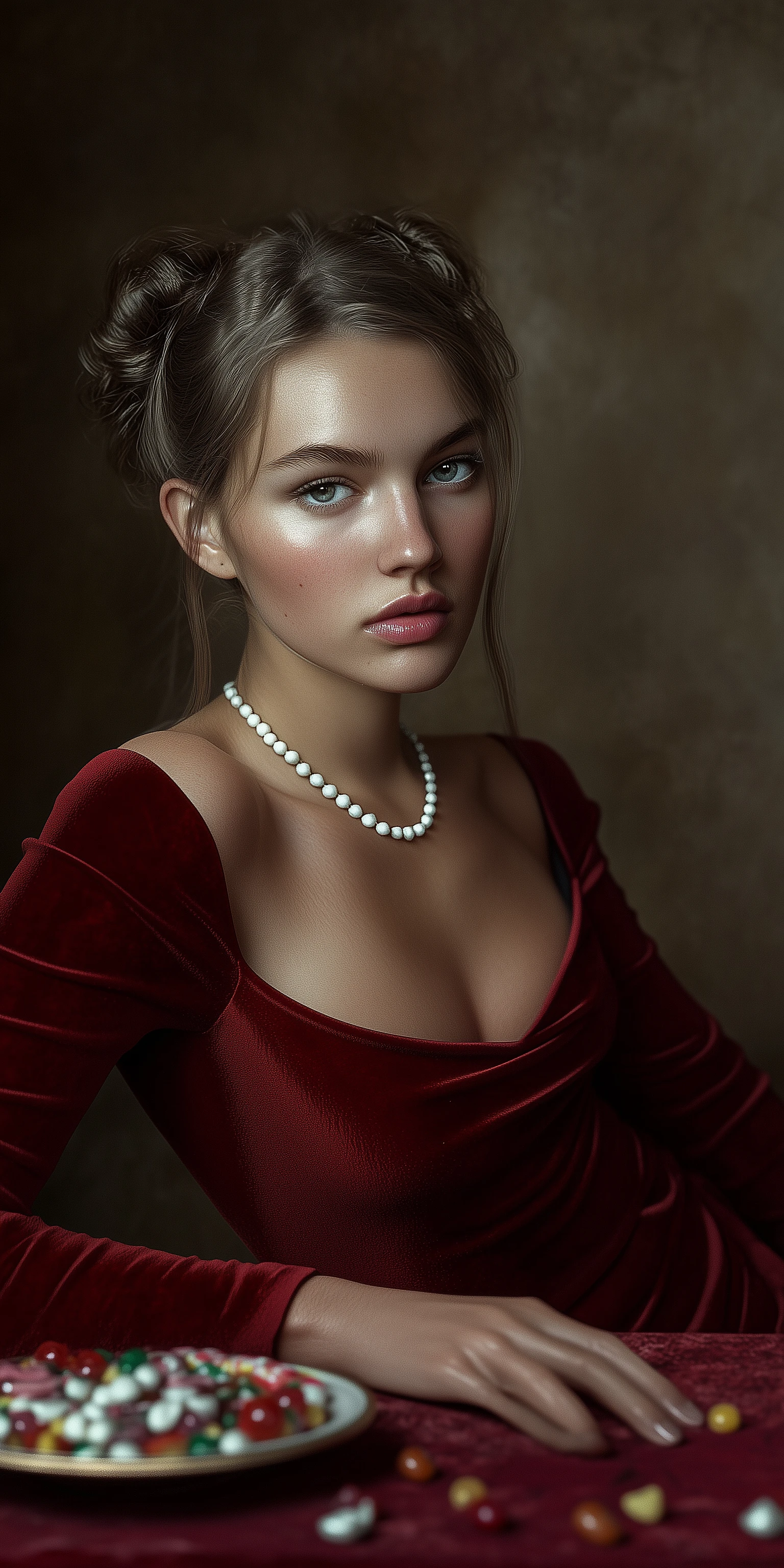 Portrait of an elegant woman in a red velvet dress, sitting at a table with colorful candies and sweets on it, looking into the camera, her hair tied back, a pearl necklace around her neck, with very detailed skin, natural lighting, and a dark background. The image is photorealistic and hyper-realistic, appearing to be a professional photograph. --ar 1:2 --style raw --v 6. 1