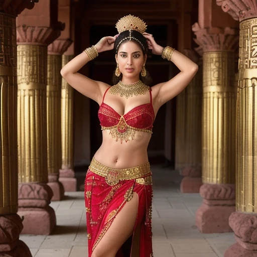 The image depicts a gorgeous with woman with Size 38 DD’s with a taut chiseled stomach in an intricate ornately detailed embroidered and adorned red belly dancing outfit, adorned with gold jewelry and a headpiece, standing in a desert temple with ornate pillars. - Her waist length dark raven hair flows around her, and she wears a matching skirt and bra, exuding an air of exotic elegance. - The skirt is split at the front, revealing her leg, and is adorned with gold jewelry and a headpiece. - The background is a desert temple with ornate pillars, adding to the exotic ambiance. - The woman's pose and attire evoke a sense of mystery and allure, as if she is about to perform a mesmerizing dance.