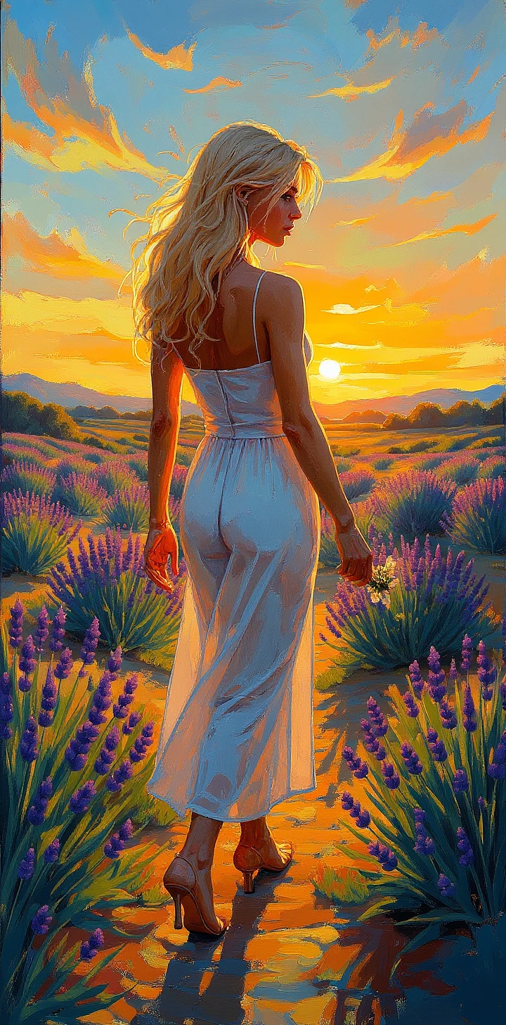 portrait of a long blonde hair woman, in the style of Greg Hildebrandt, provance landscapes, a woman walking towards the lavender fields , wearing light summer dress, holding flower in her hand spray painted realism, hard-edge painting --chaos 75 --ar 1:2 --style raw --profile rsy6uq9 --stylize 750 --v 6. 1