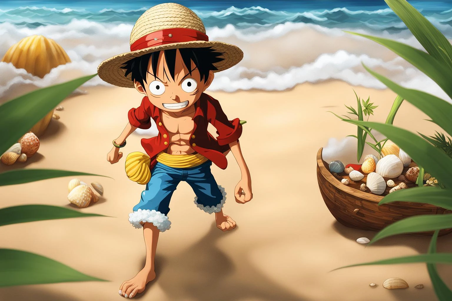 Flat illustration, 3d, close up, a little cute boy cosplaying Monkey D. Luffy, one piece anime, near sea stormy foamy waves, in battle stance
