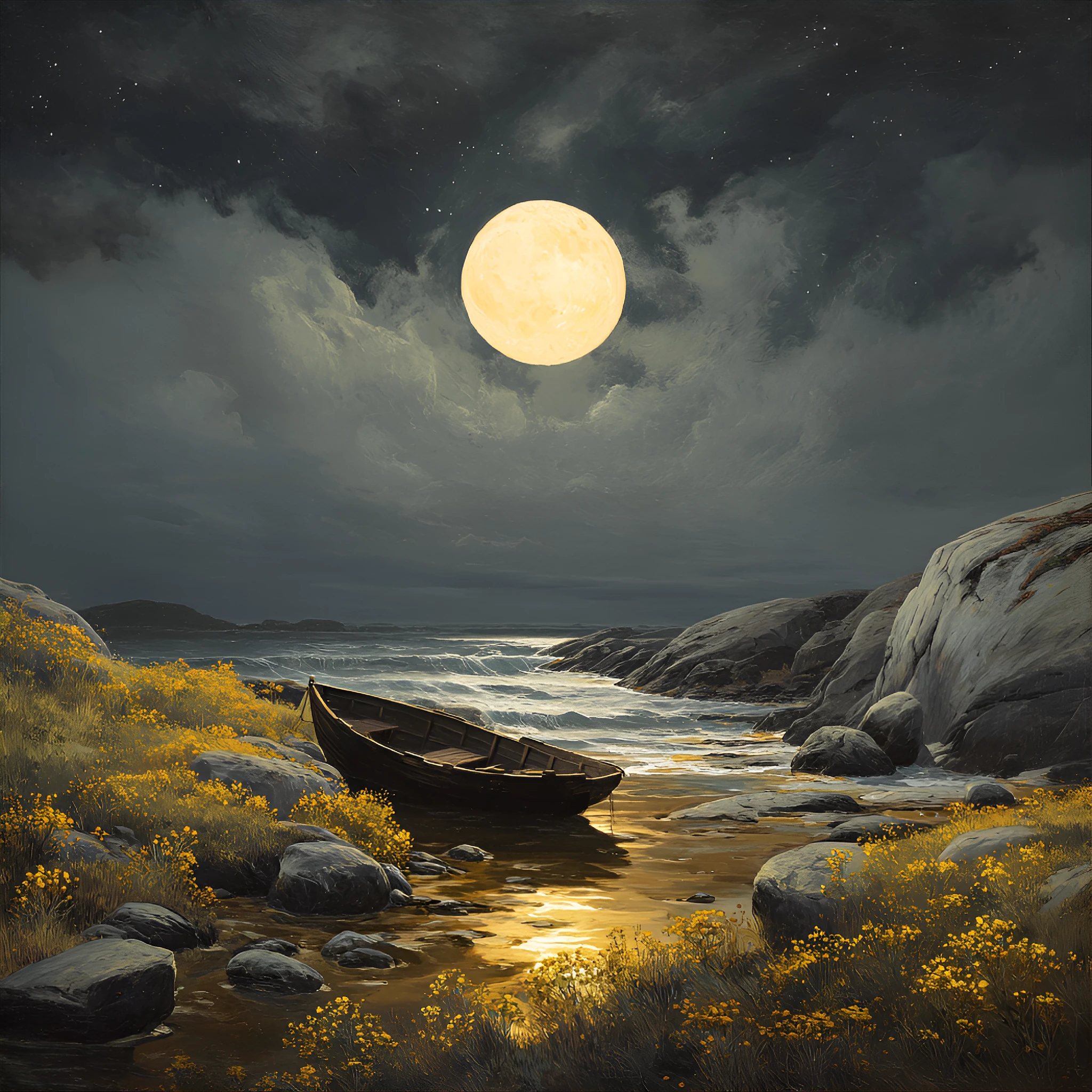 coastal scene at night, featuring a large, golden-yellow moon dominating the sky, contrasted against dark, stormy clouds. A small, dark wooden fishing boat rests on a rocky shore, positioned slightly left of center in the image. The water near the shore is a reflective golden hue, reflecting the moon and the surrounding landscape. Bushes and small yellow flowers line the shore, complementing the golden-yellow color scheme. Gray and black rocks are scattered along the water's edge. The ocean water is a mix of dark gray and dark blue, with visible waves. The composition is balanced, with the boat and the shore elements as the focus, framed by the dramatic night sky. The overall style is painterly, with a soft, atmospheric quality and detailed textures. A sense of tranquility and wonder is evoked by the scene.