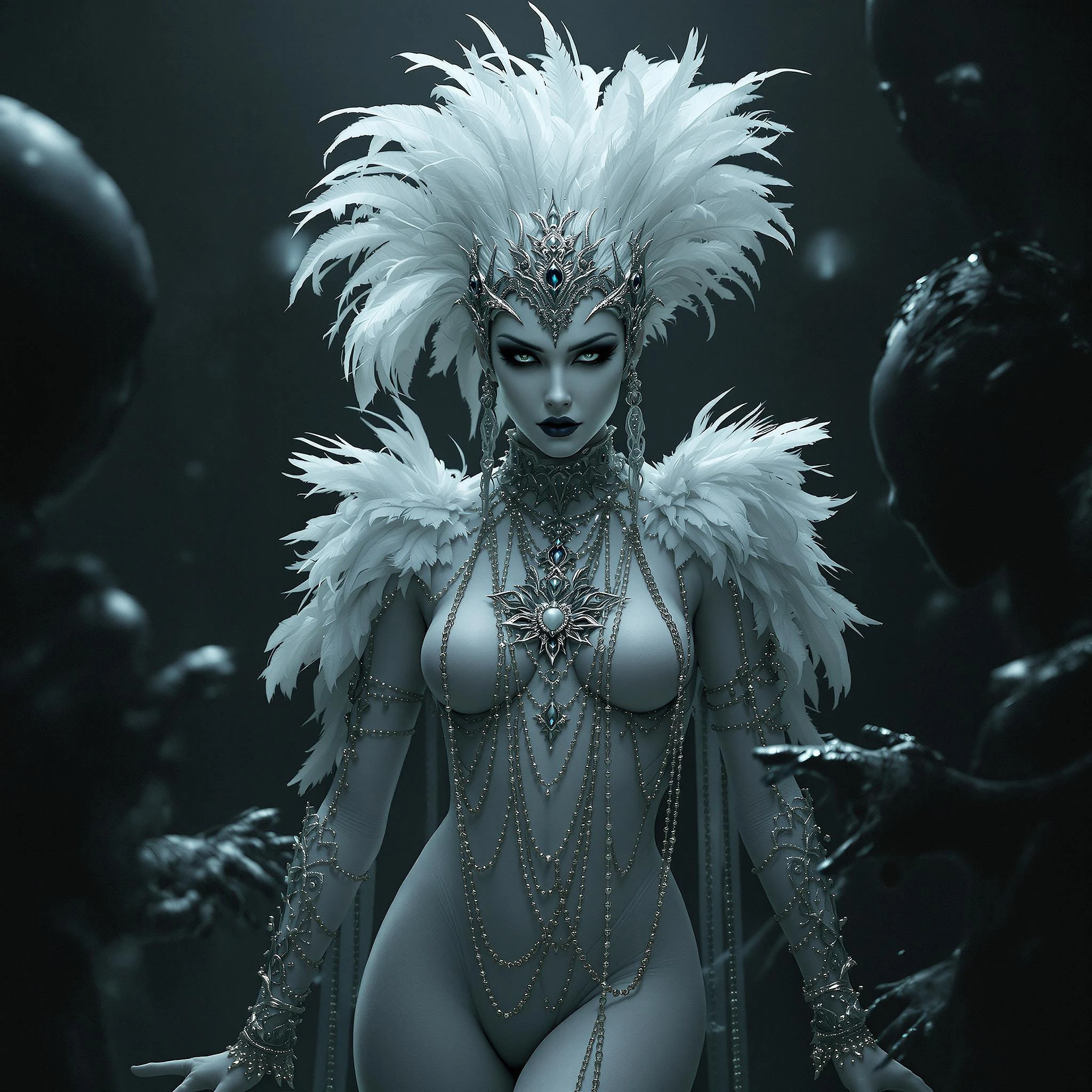 wide shot camera lens, dramatic lighting, mysterious mood, pale skin, elegant white bodysuit, intricate silver chains and embellishments, feathered headpiece, gothic makeup, dark eyeshadow, pale lips, surrounded by shadowy figures, monochrome palette, fantasy atmosphere, surreal elements, studio photo, high detail, sharp focus, trending on artstation, photorealistic
