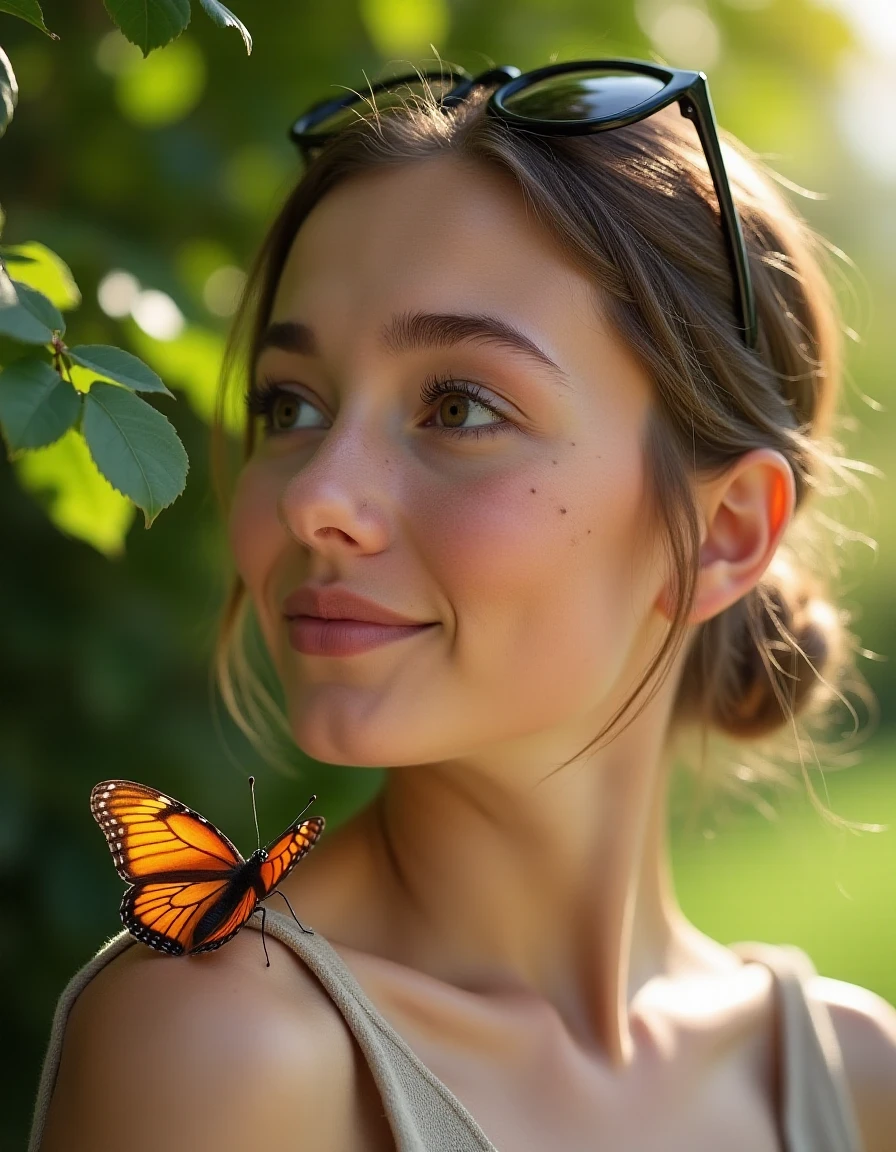 photography of a young french woman with a butterfly lying on her shoulder, pale skin, round face, surprised air, smile, looking at butterfly, (freckles) , light brown eyes, hair gatherd in chignon, sunglasses on forehead, soft light, leaves and the sun shining , upper body, portrait, from side, depth of field, leaves and trees in background