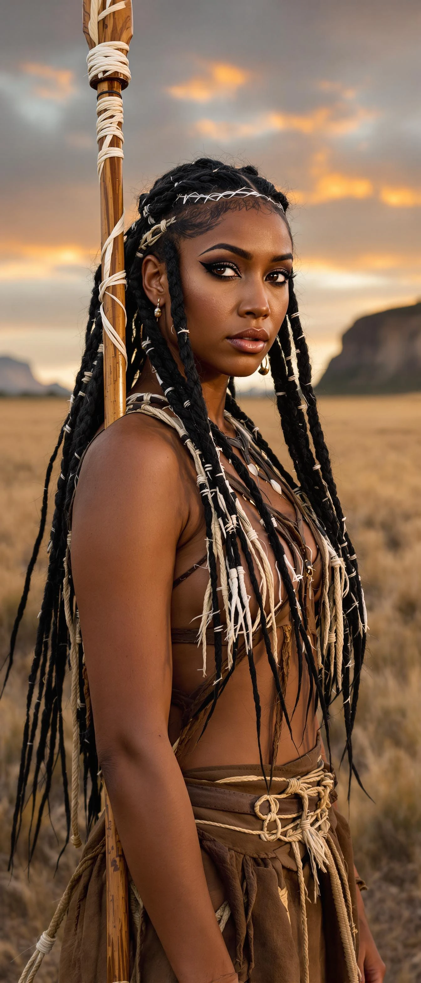"Image is a high-resolution portrait photograph captured with a Sony A1 50. 1 MB camera using a 75mm prime lens, of an exceptionally beautiful native American female with flawless pale brown skin, large beautiful brilliant golden brown-Hazel eyes, black eye liner, looking into camera, dark black eye shadow, small dimples in cheeks very long black braided hair with white twine interwoven in the braids, tousled ends. Dressed as a native American warrior. She is standing full body view, in a large open plain with high cliffs in the distance during a golden hour sunset, single wooden spear in hand, bow and quiver on her left shoulder. Photo-realistic, front view, highly detailed, volumetric, dramatic light. "