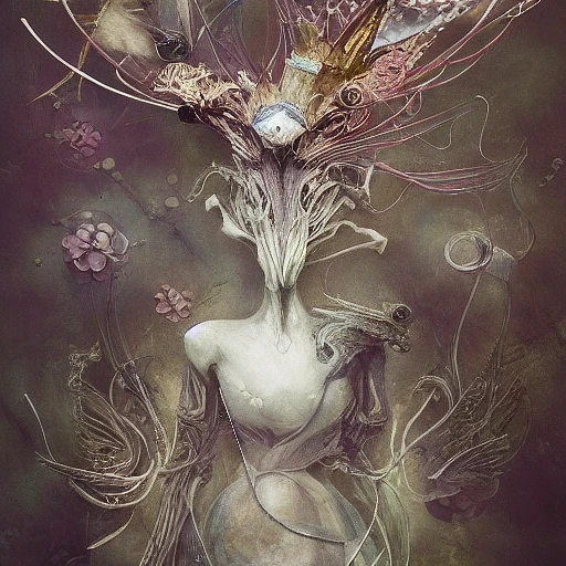 unknown creature Illustrated by Yoshitaka Amano, Ellen Jewett, and Leonora Carrington:: A detailed, elegant, intricate, colorful portrait in mixed media:: A masterpiece of surreal art, a vibrant painting, --ar 2:3