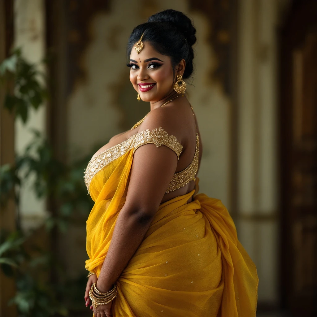 Transparent yellow black slightly plus size Indian bride woman without blouse and undergarments, tight full front view large round heart shaped sexy boobs front side view bikini with side view of large boobs looking at her back to me with beautiful black eyes plus size legs with high heels matched color cleavage realistic looking Sexy Indian plus size sexy white Indian woman looking smiling at me with sexy eyes and beautiful skin color with smiley face a Indian hot and sexy side view girl looking at her back standing on her heart shaped ass butt boobs and legs transparent gold and black very tiny and slim bare and tiny transparent bare bra boobs and hip see through bra and tiny while panty , capture the delicate contours of her face and the intricate details of@purple her classic hair style black vibrant colors to capture the intensity of the garden her hairs styles Gorgeous Cupcake Hued Bun-Style Bridal Hairstyle, she is laughing out loud sexy with moody look alluring