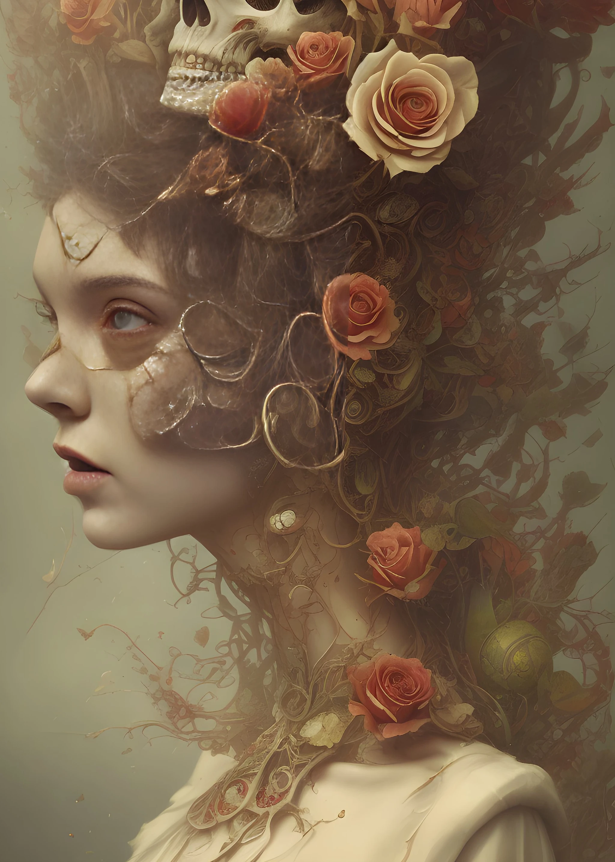 mdjrny-v4 style, Alice in Wonderland, roses, bullets, highly detailed, half skull face, cinematic, 8k, by Tom Bagshaw, by Greg Rutkowski, by Carne Griffiths, by Ayami Kojima, by Beksinski, trending on artstation, hyper detailed, horror, full of colour