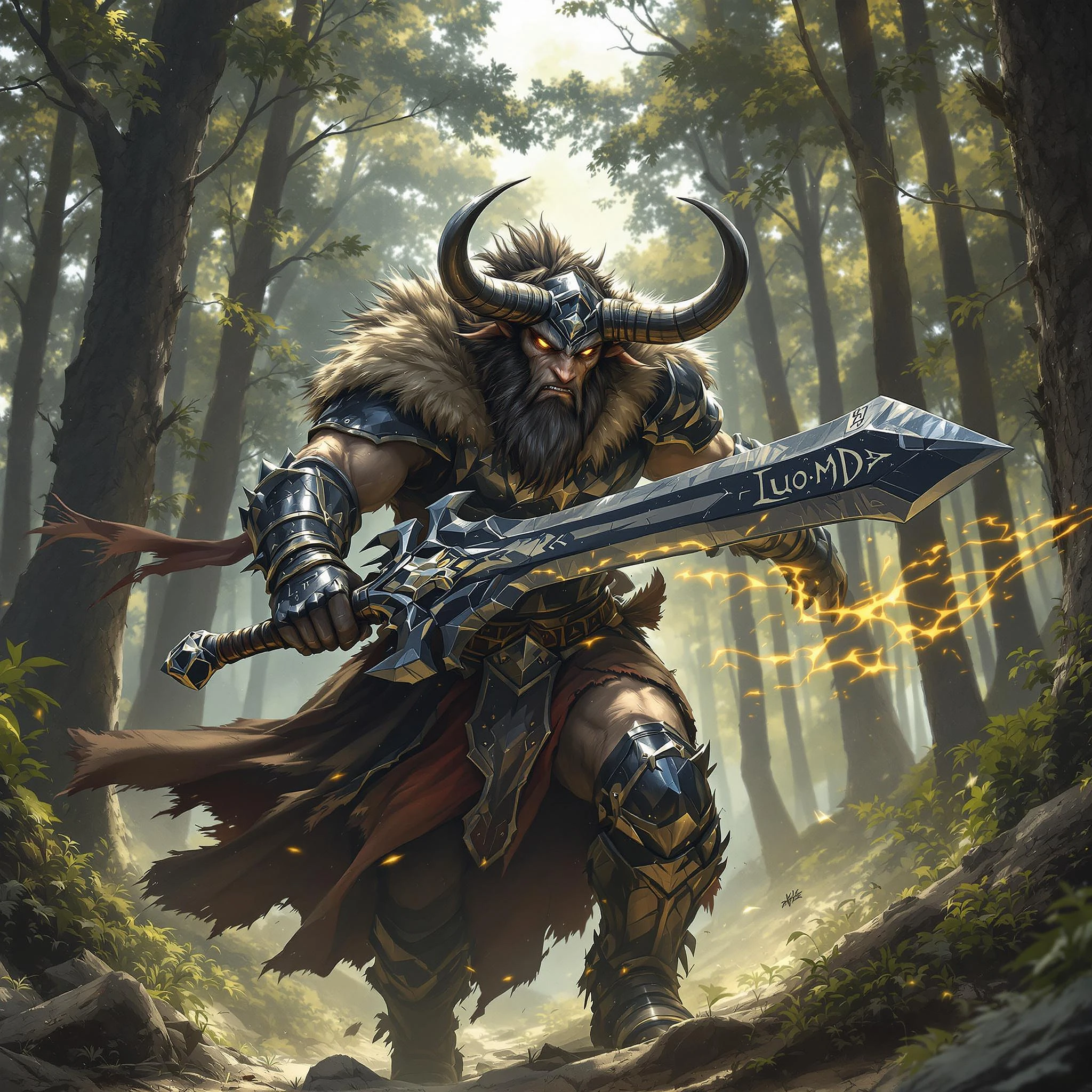 A handsome-faced minotaur warrior, clad in battered black chrome armor, charges forward into the middle of a forest. His fur-lined cloak billows behind him as he lunges. His face expresses seriousness. He wields a huge greatpick, which he holds with both hands due to its enormous size. Flashes of light seep from the engraved hilt in the form of runes that glow in the sunlight filtering through the trees. The trees stand tall, their branches melting against the sunny sky.