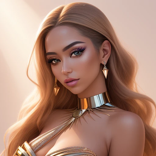 a commercial photo portrait of stunning instagram model, sparklecore, appropriation artist, shiny/glossy, clear edge definition, unique and one-of-a-kind pieces, light brown and light amber, Fujifilm X-T4, Sony FE 85mm f/1. 4 GM --ar 45:56 --s 1000 --style raw --v 5. 2