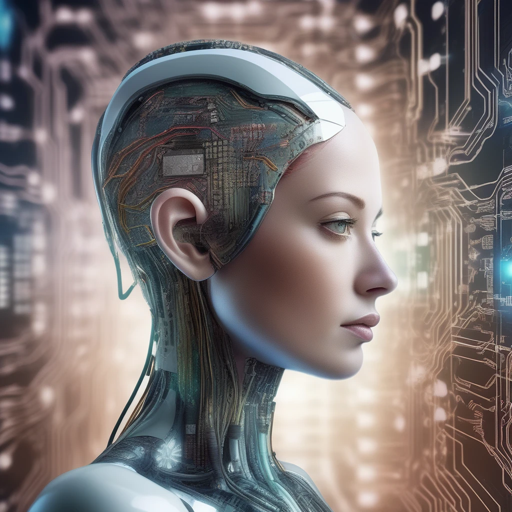 Majestic, portrait, an android woman with a brain made of circuits, hyperrealistic, with a surreal futuristic background behind her