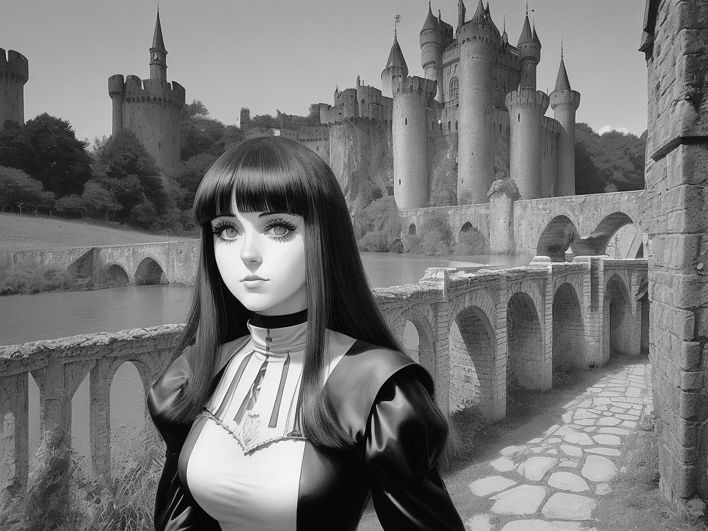 foto de gran calidad de una chica gotica anime en estilo retro vintage anime, al estilo de berserk, la chica esta parada mirando a camara con una expresion sadica de felicidad con la lengia afuera mostrando colmillos afilados, hay un castillo gotico de fondo de la epoca media val y es de noche, todo detras de la chica se ve desenfocado.