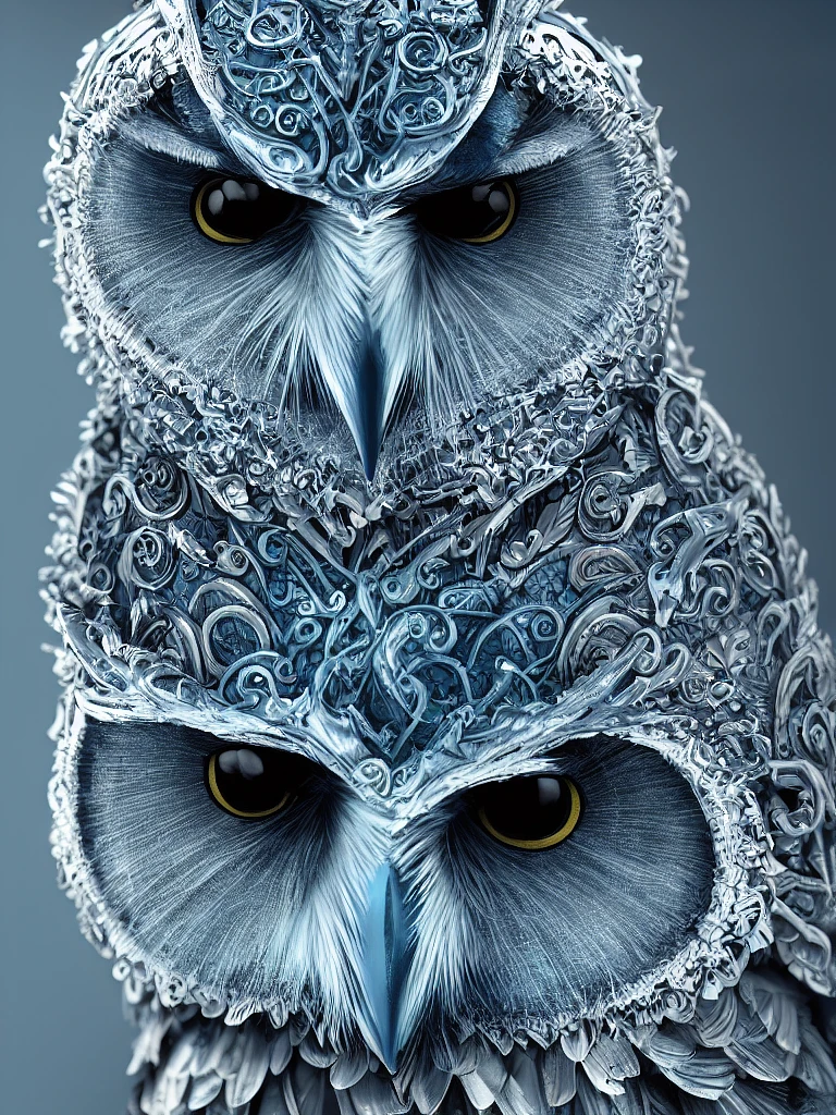 Anthropomorphic blue owl, big green eyes, lots of details, portrait, finely detailed armor, cinematic lighting, intricate filigree metal design, 8k, unreal engine, octane render, realistic, redshift render