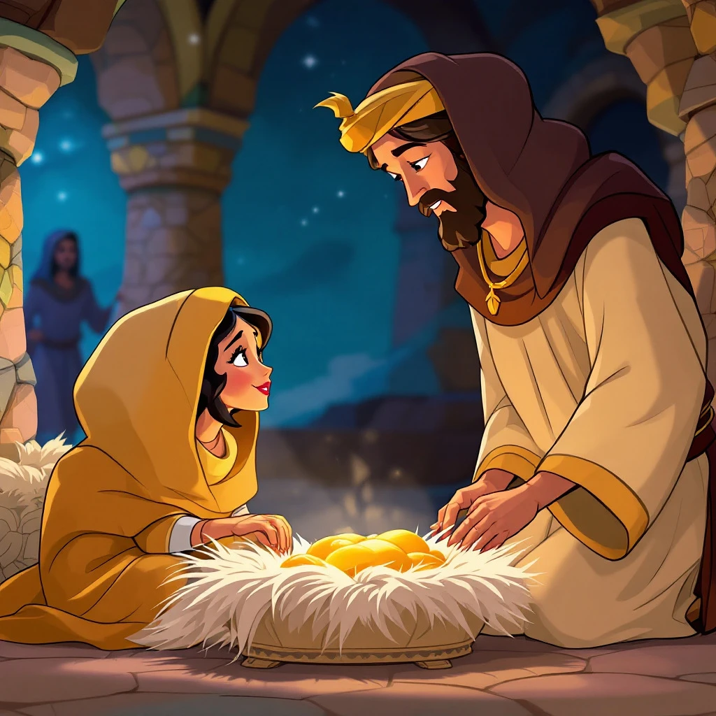 A jOSEPH AND mARIA FROM THE NATIVITY IN A CARTOON DISNEY