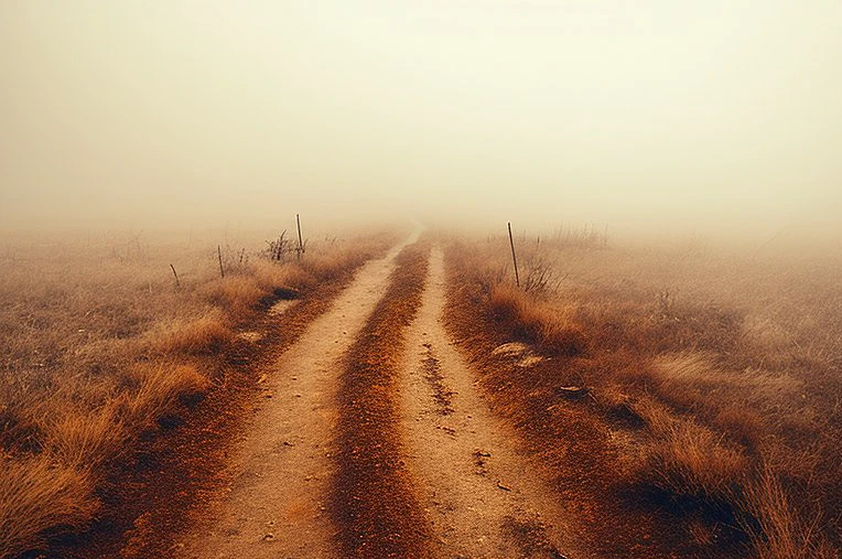 endless foggy trail in steppe, depressive and omnious landscape, evil white fog, empty land, white and brown dirty colors, autumn, autumn depression, silent hill, horror movie, cinematic shot, 35mm v. 5 --ar 3:2