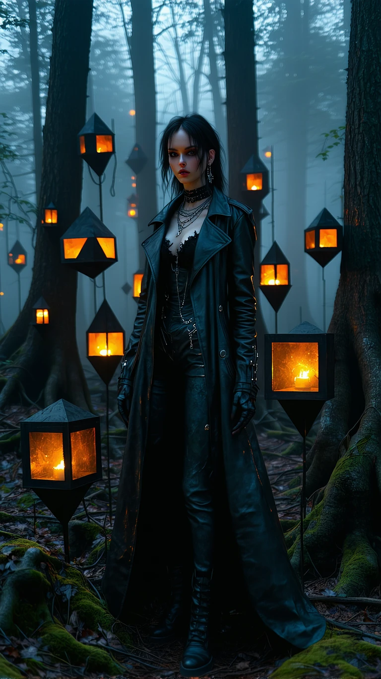 Haunted forest at twilight, dense skeletal trees fading into fog, lit by an unnatural burnt-orange glow. Creepy geometric elements—floating black pyramids, fractured hexagons, and distorted cube frames—hover and cast warped shadows. The gothic model stands in the foreground, illuminated with cinematic side-lighting, her black leather coat glistening faintly, lace choker and layered chains reflecting subtle metallic tones. Her gaze is cold yet magnetic, embodying the elegance of darkness. Ultra-detailed, moody atmosphere, 85mm fashion lens look, dramatic chiaroscuro lighting, surreal realism