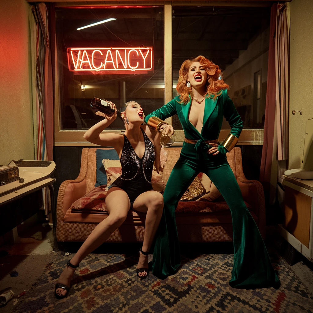 two women in a dilapidated motel room, dimly lit by a flickering neon "VACANCY" sign outside. They pour wine into mismatched glasses and laugh maniacally. one is wearing sleek black romper with glittering rhinestones, mimicking stars and bold red lipstick. the other woman is wearing A vibrant emerald green jumpsuit with flared legs and a plunging neckline. Gold cuffs on both wrists and her hair styled in loose, fiery waves.
