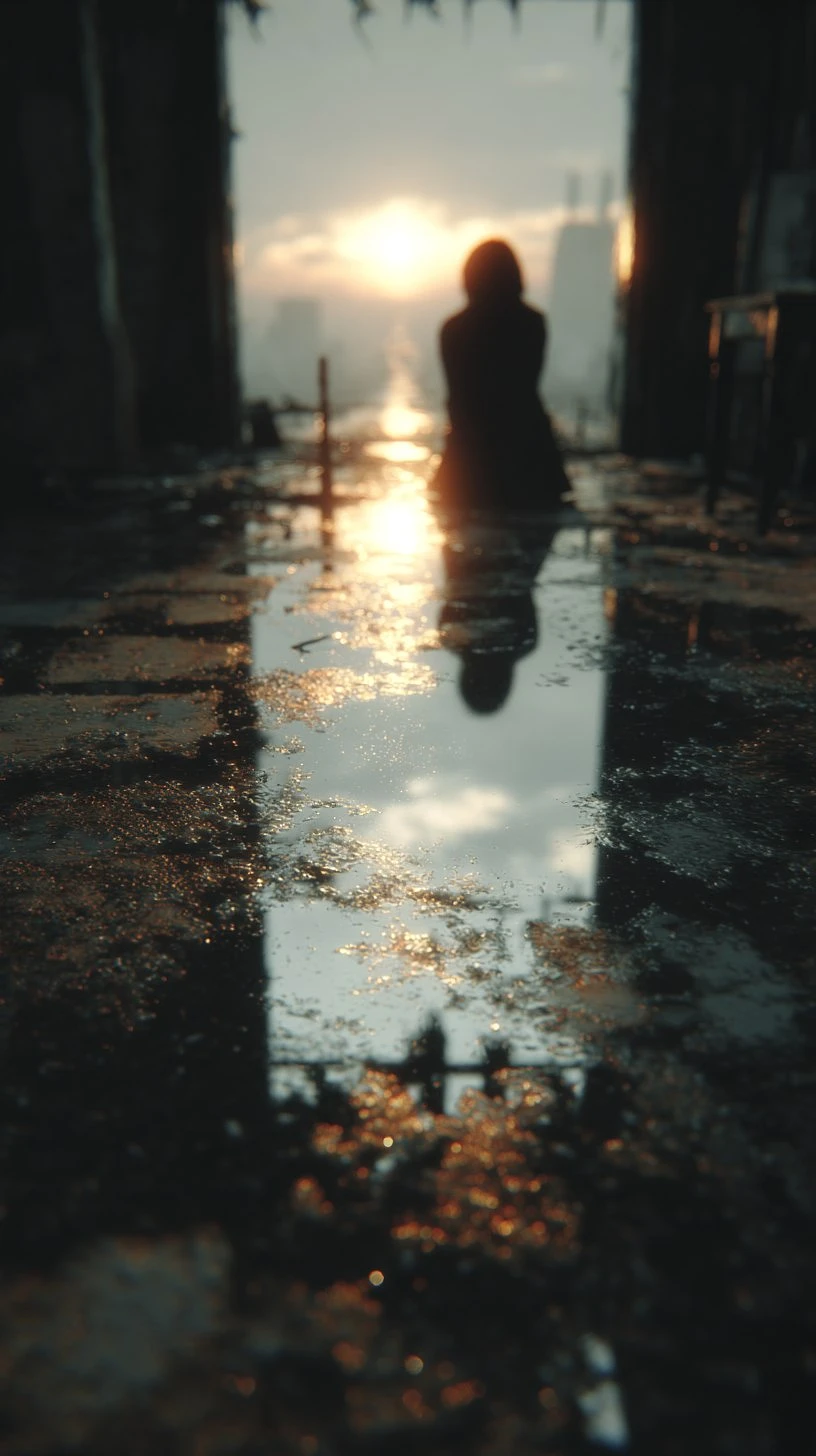 A realistic photograph of a person sitting on the ground, facing a window with a bright golden hour sunset. The shot is a first-person view, looking down at the wet, dirty floor. The person and the sunset are reflected in a puddle on the floor. The reflection is clear, but with a slight ripple from the water. The image has a cinematic feel with a shallow depth of field. --ar 9:16 --s 750