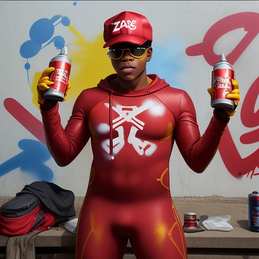 JOHN BOYEGA IN A RED SPANDEX SUIT, WITH YELLOW GLOVES AND BOOTS , SUNGLASSES AND RED BACKWARDS CAP HOLDING TWO SPRAY CANS . . . WITH A ZOZ GRAFFITI IN THE BACKGROUND