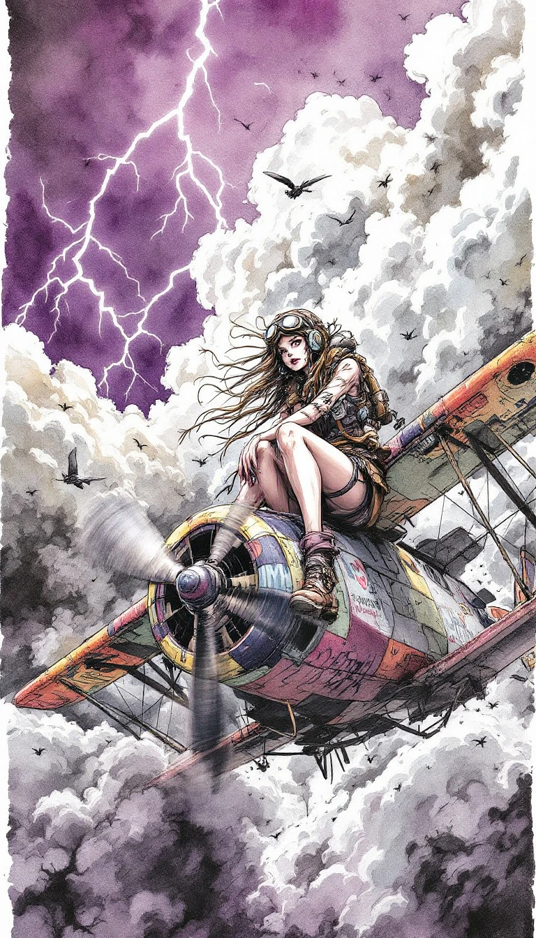 (2) A dynamic ink wash illustration, reminiscent of Ralph Steadman, features a rebellious female pilot perched precariously on the wing of a dilapidated biplane soaring through a storm-tossed, purple-hued sky. Clad in tattered flight gear and goggles, her determined gaze and windswept hair convey a spirit of fearless adventure. Her plane is a patchwork of rusty metal and vibrant, hand-painted designs, while bolts of lightning illuminate the scene. Conceptual illustration, high energy, expressive, chaotic, punk.