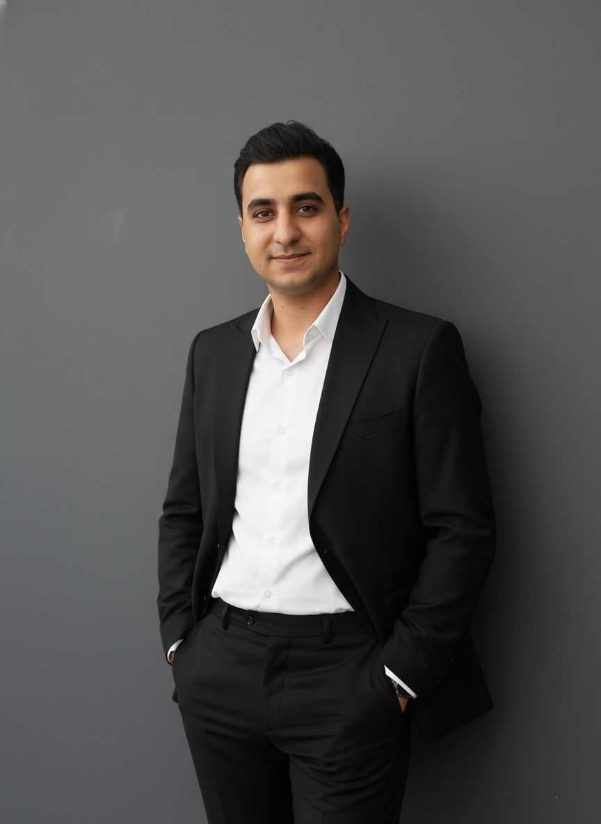 Make this face A photorealistic portrait of the person from the uploaded image. A handsome South Indian man with a neat beard and mustache, wearing a sharp black suit jacket over a crisp white shirt, and black trousers. He is leaning casually against a dark grey wall with his hands in his pockets, looking at the viewer with a friendly smile. The lighting is soft and even, highlighting the textures of his clothing no beard