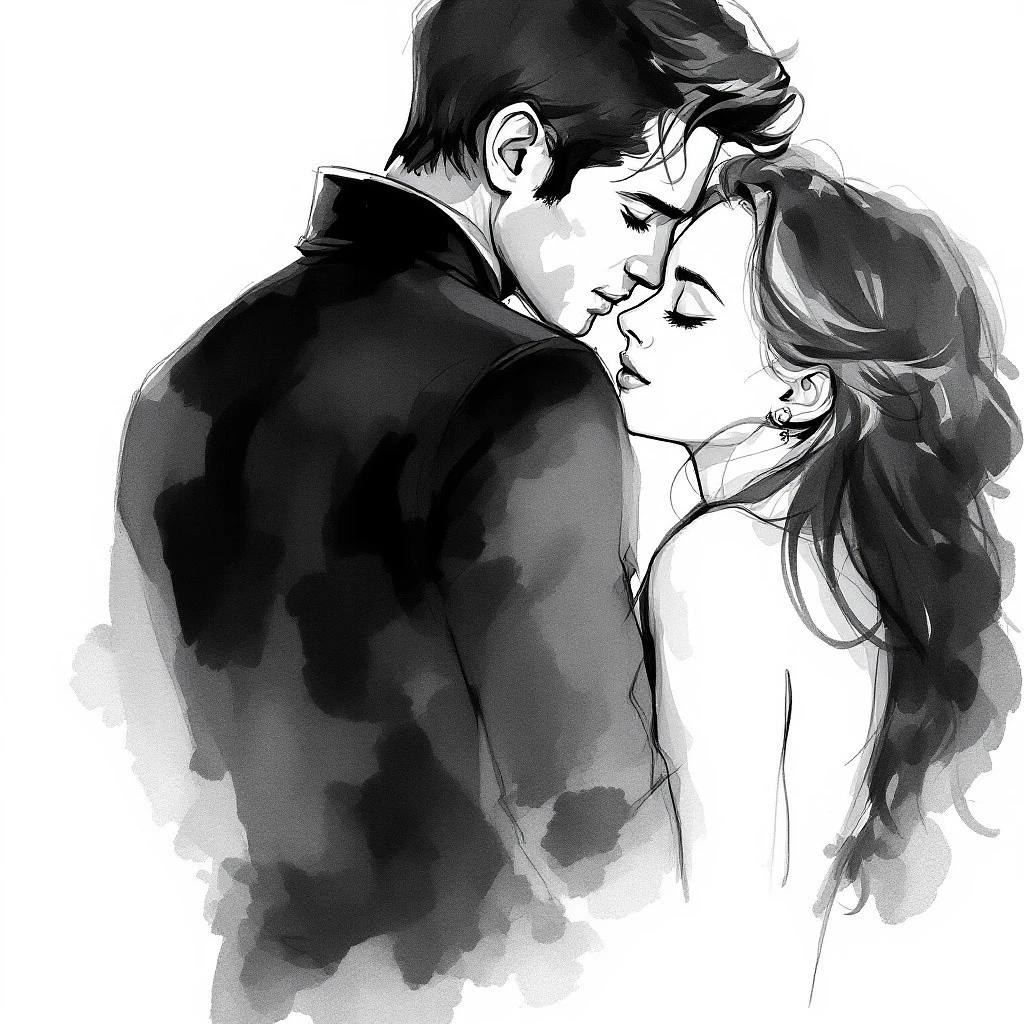 A monochromatic watercolor painting of two figures, presumably a man and a woman, in an intimate pose. The man appears to be leaning in towards the woman, with his head resting against her shoulder. The woman, on the other hand, is turned slightly away from the viewer, with her back facing the viewer. The artwork captures the essence of human connection, with soft brush strokes and a blend of grayscale tones. in the style of Brush pen drawing --v 6