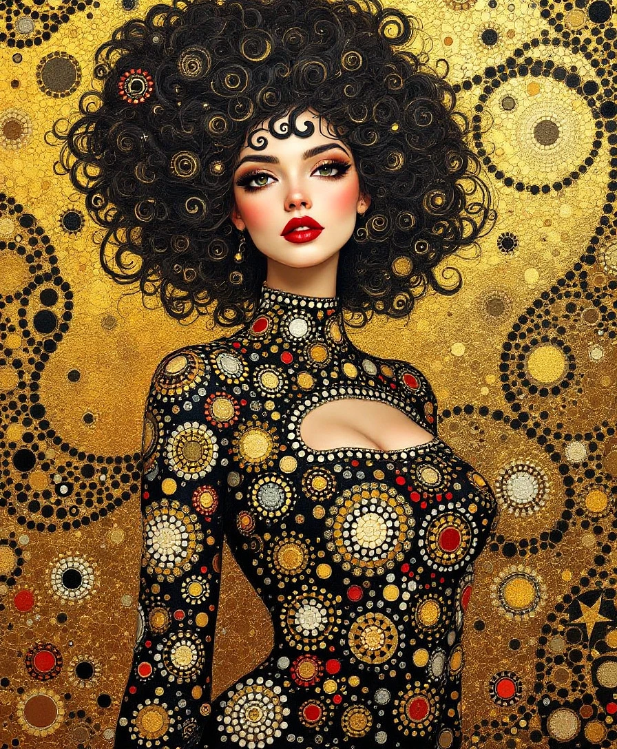 Prompt: "A highly detailed, Gustav Klimt-inspired portrait of a woman with voluminous, curly hair adorned with intricate swirls. She is wearing an elaborate, mosaic-patterned black dress with vibrant gold, red, and white circular designs. The background is a textured, golden mosaic with abstract circular patterns, blending shades of gold, black, and red. The overall style is ornate, decorative, and artistic, with a focus on rich colors and intricate details. "painting by Gustav Klimt --niji 6