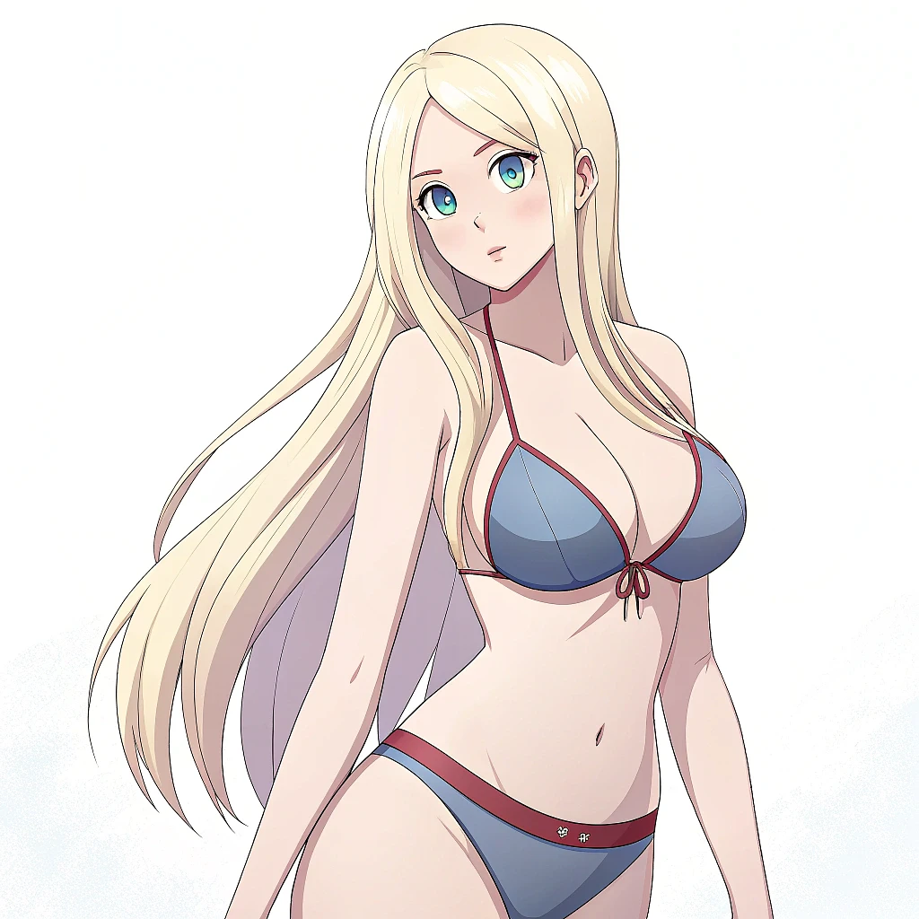 Estilo anime, mulher de pele branca, cabelos loiros, lisos e longos, olhos azuis, corpo em formato ampulheta, curvilínea, busto avantajado, quadris largos, roupas de banho, corpo inteiro.
