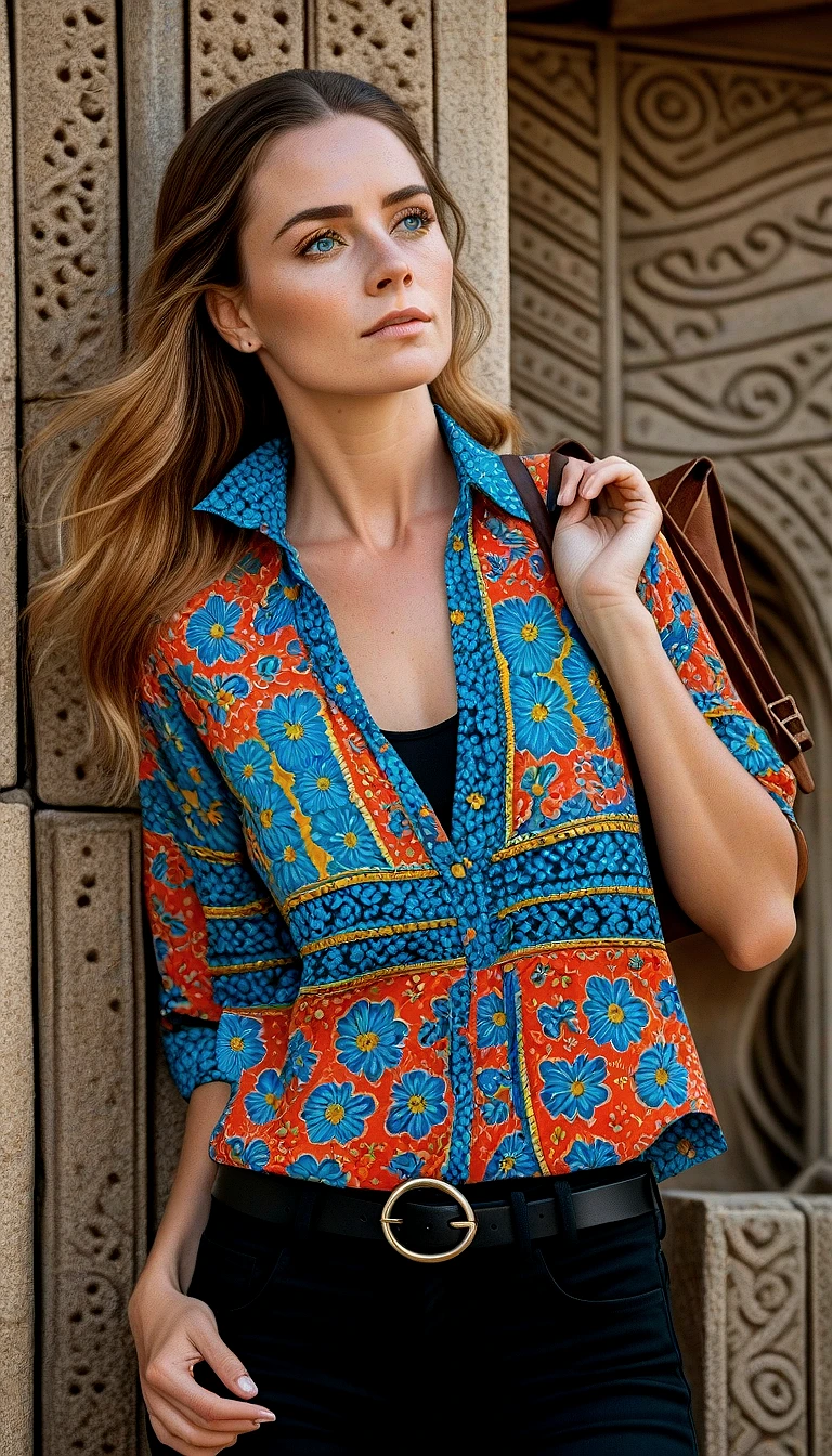 A highly realistic, beautiful lady with (freckles:0.95) , blue eyes, batik shirt, black jeans, holding handbag, Bali, outdoor settings, UHD, 32K, masterpiece.
