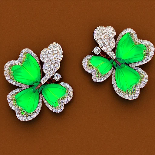 full display of baroque style jewelry design, a pair of earrings, green gemstones with different saturation winged butterflies and four-leaf clover shaped diamonds, roses sharp, highly detailed vray render, flash, high quality, 10 k
