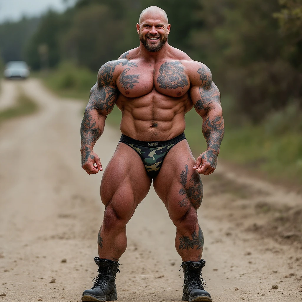 Full body image, tall fit bodybuilder, heavily tattooed, slim face, chiseled jawline, shaved head, huge penis bulge in camouflage print thong underwear, big feet in black combat boots, big smile, standing outside on dirt road