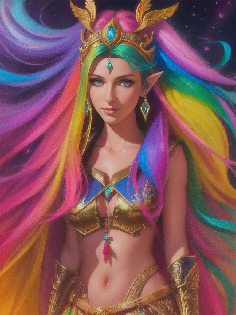 1 girl, [Blake Lively|Emily Ratajkowski|Famke Janssen] as Zelda with rainbow hair, vivid colors , stunning eyes, amazing eyes, elaborate dress, one piece character, simetric body, full body, extremely detailed, cinematic lighting, high contrast, artstation, Illustration, Portrait, Oil Painting, Earle K. Bergey, Karol Bak