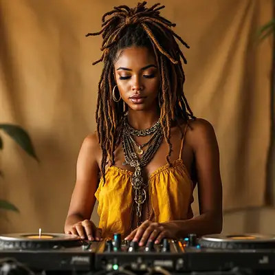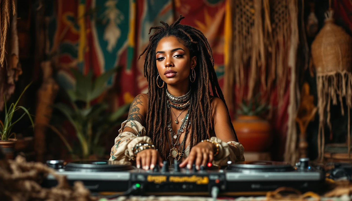A photo of a 30 year old a Egypt girl, light tanned skin, real skin texture with dreadlocks,  desert punk clothing,  natural,  full body,  lots of jewelry,  hyper realistic,  background Jamaican tropical cozy atmosphere,  she is a DJ playing music on turntables, realistic light , no foreground objects
