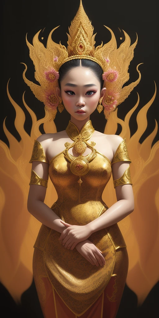 Thai dress costume, in the style of surrealistic portraiture, feminine affluence, digital art wonders, symbolism, Thailand art, illusionary paintings, golden hyper-detailed, hyper-realistic, 4d dimension, ultra-detailed, highest detail quality, ultra-realistic, looks at views Medium Full Shot , cinematic--ar 28:27 --quality 2 --s 750 --v 5. 1 , focused, extreme details, unreal engine 5, cinematic, masterpiece, art by studio ghibli, intricate artwork by john william turner