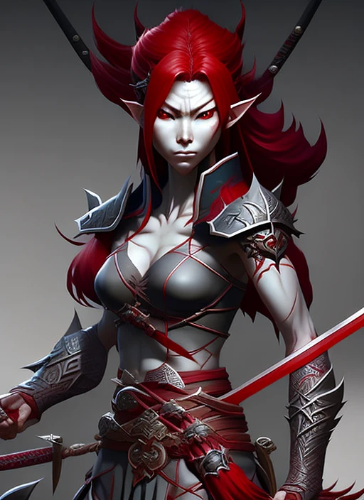 evil elf samurai with grey skin and red hair, ultra realistic, concept art, intricate details, eerie, highly detailed, photorealistic, octane render, 8 k, unreal engine. art by artgerm and greg rutkowski and charlie bowater and magali villeneuve and alphonse mucha