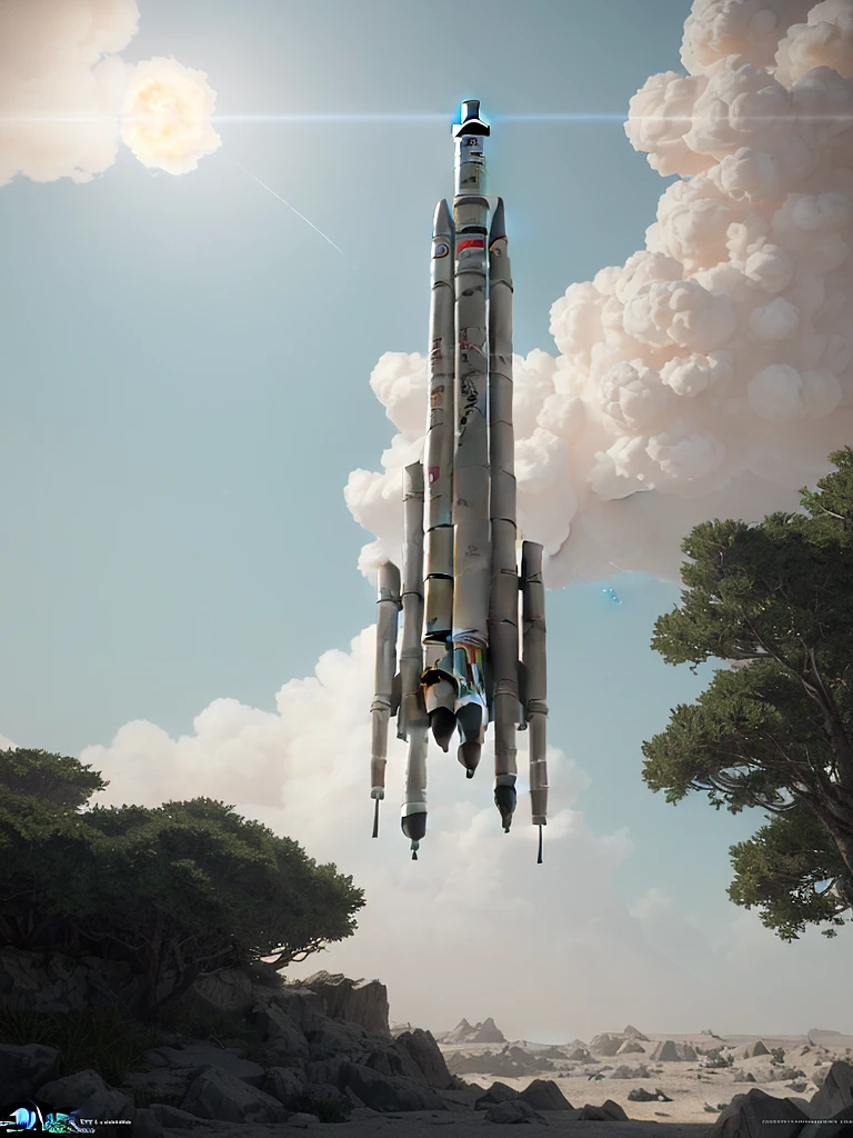 Photo of a ultra realistic missile on rote, bright light, cinematic lighting, battered, low angle, trending on artstation, 8k ultra HD, hyper realistic, focused, extreme details, unreal engine 5, cinematic, masterpiece, art by studio ghibli, intricate artwork by john william turner