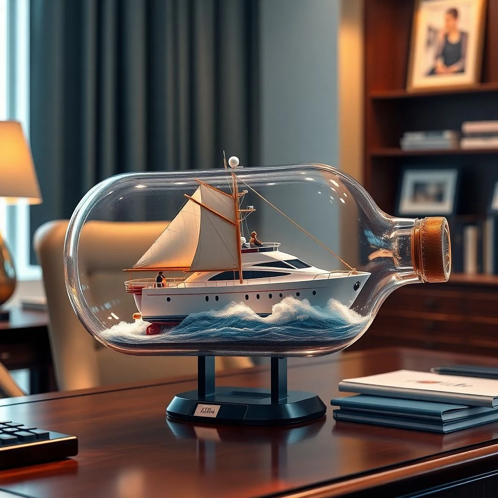 A realistic ship in a bottle, featuring a ((2005 68 foot Lazarra ((enclosed) ) fly bridge)) luxury super yacht scene. The yacht name "Sweet Emoean" is visible on the side. The scene includes cresting waves, capturing a vibrant, dynamic moment. The bottle sits on a stand as a decoration on a professional-looking desk in a well-appointed home office. Highly detailed, ultra-realistic, cinematic, 8k. Negative prompt: text, logos, watermarks, out of frame, ugly, extra limbs, extra hands, extra feet, extra fingers, bad anatomy,