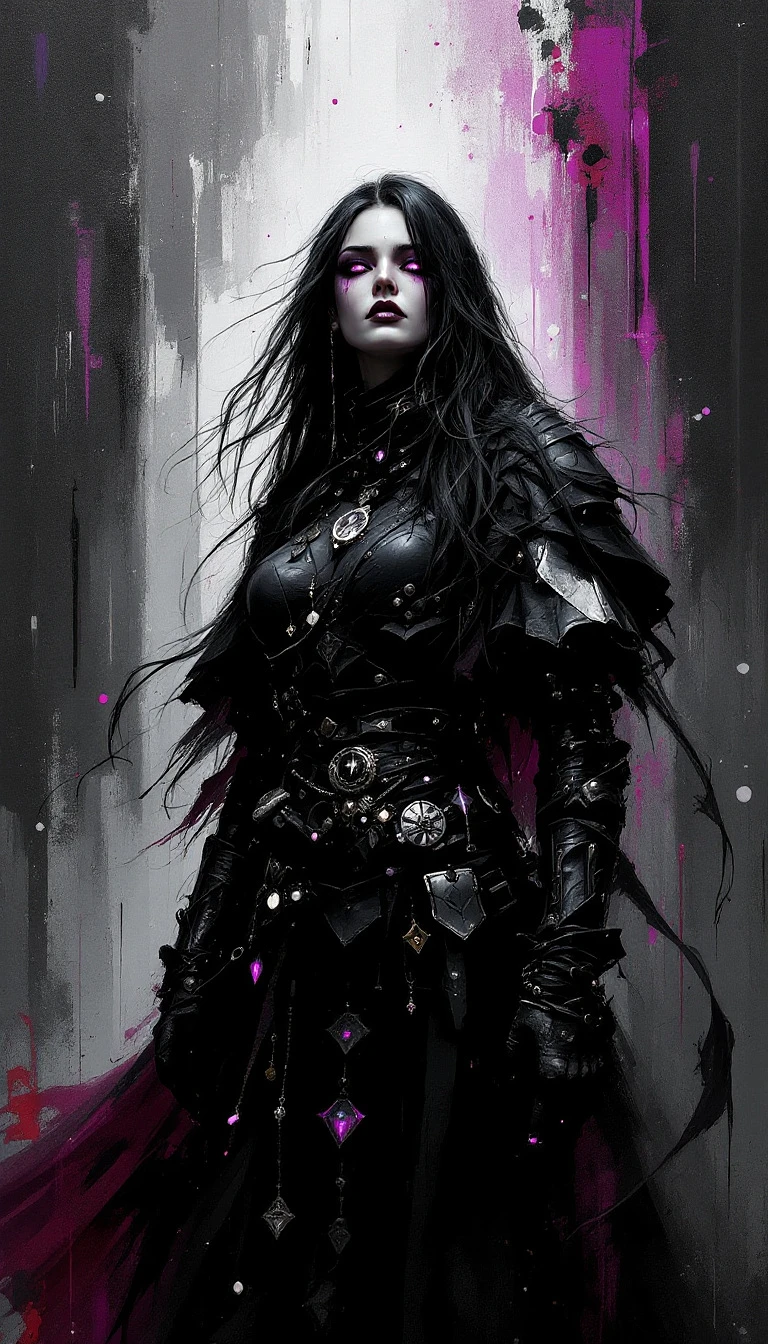 "Onyx Sorceress in a Shadowed Citadel": A powerful abstract painting captures a sorceress, exhibiting both strength and a deep connection to the shadowed arts. She is a skilled weaver of magic, shown within a dark, shadowy citadel, where magical energies seem to flow around her, with a dark complexion, long, flowing onyx black hair often styled with a mystical touch, and a structured, practical outfit with leather armor and many hidden pockets. Talismans, amulets and other magical items are attached to her clothing and are often clasped in her hands. The artwork masterfully blends modern abstract ideas and character representation, creating a mysterious and awe-inspiring scene using tones of blacks, grays and purples. Her piercing, violet eyes, the focal point, convey a strong will and a powerful connection to the magical world. After a long night spent working with her craft, the sorceress embodies both a dark power and a strong and ancient beauty. The bold shapes and subtle textures invite the viewer to uncover the hidden stories within this vibrant piece presented as a painting.
